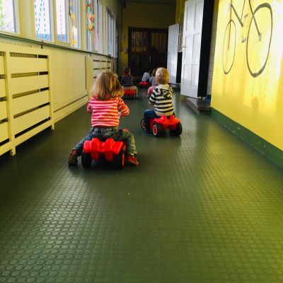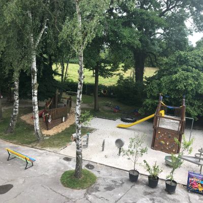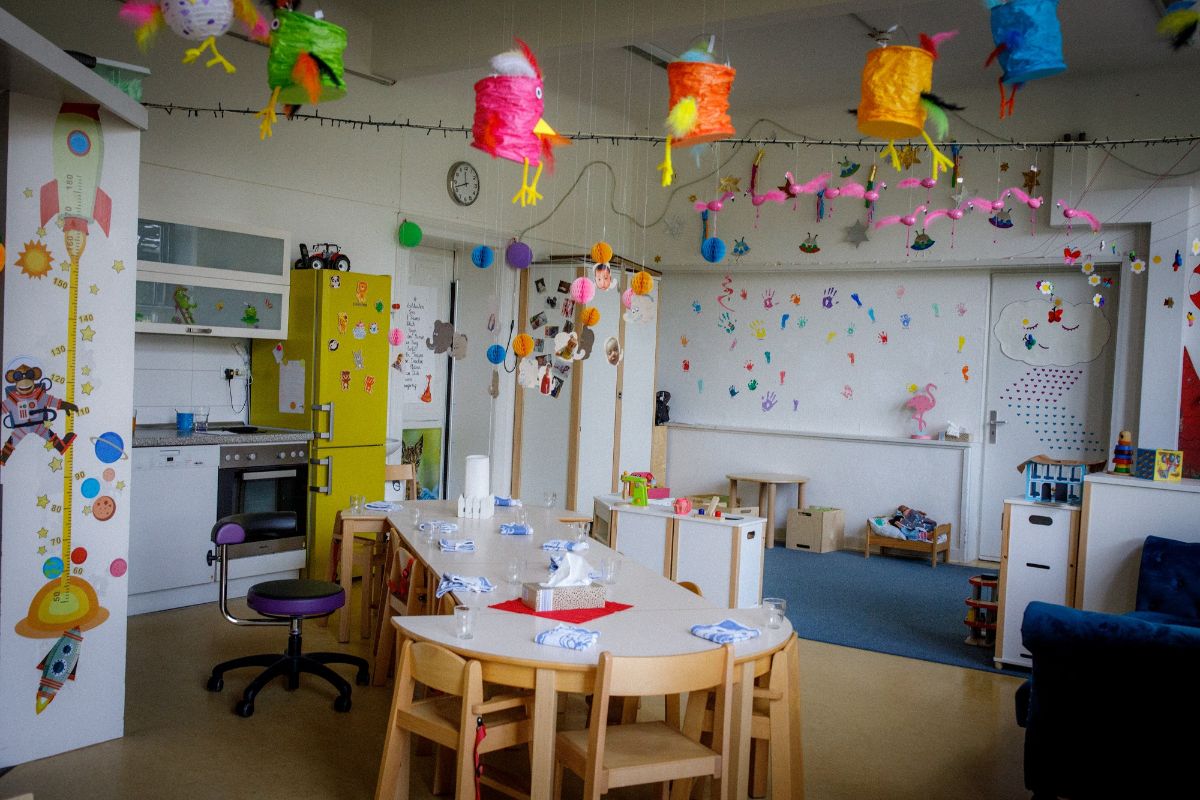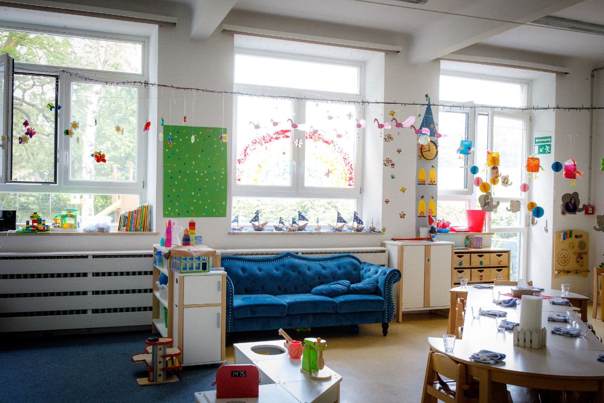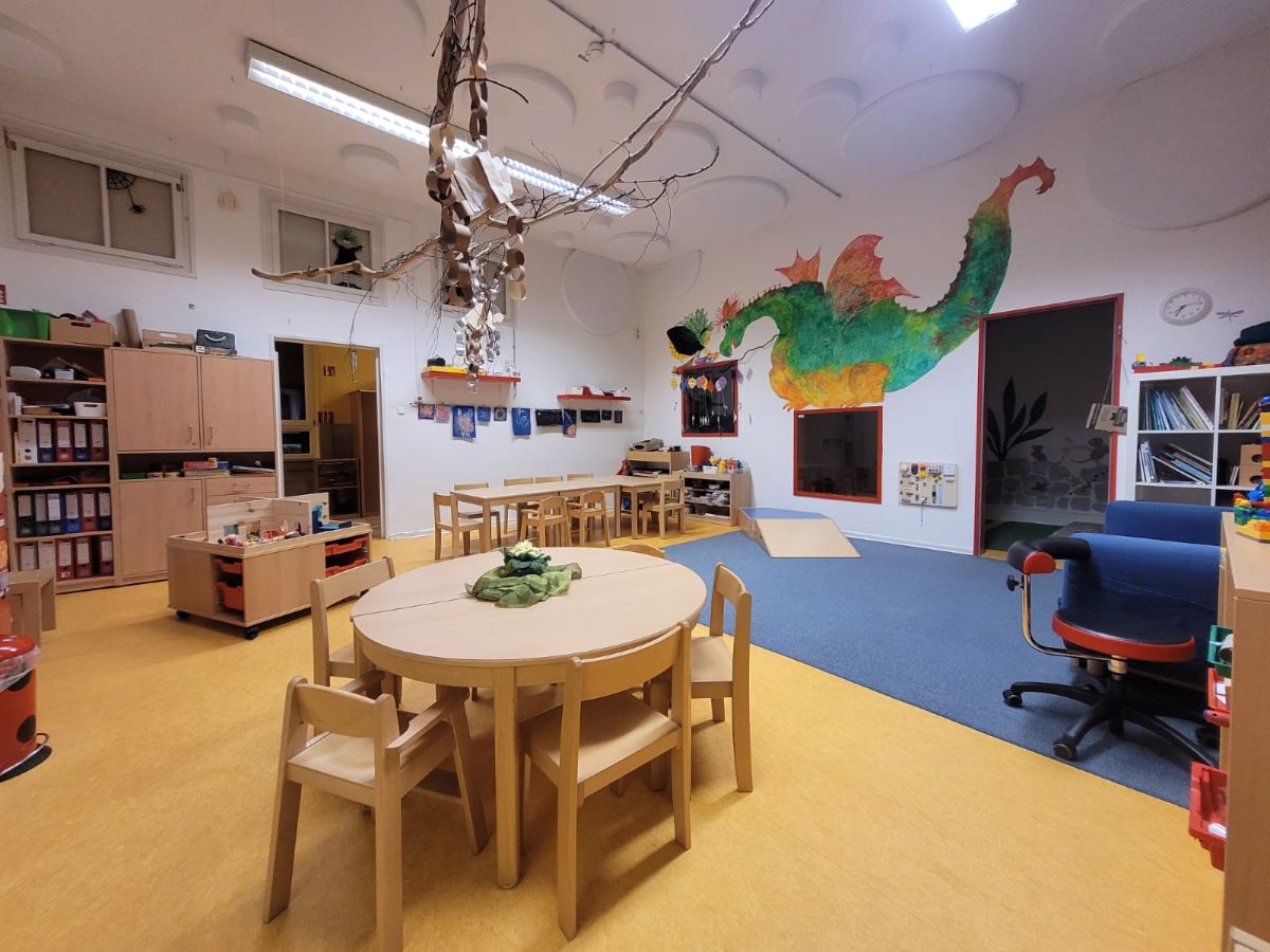 Foto von mehreren Kindern auf dem Boden bei Kinder Oase, Lehrerin dahinter. Junge zeigt Daumen hoch. Rechts stilisierte Figuren. Text: Sehnsüchte wecken, miteinander lernen.
